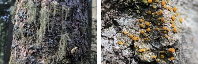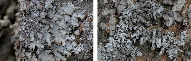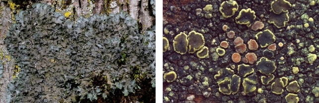 Zwei Flechten, die bisher aus dem Kanton Graubünden noch nicht bekannt waren: Links die baumbewohnende Essigflechte (Pleurosticta acetabulum) und rechts Gislers Kuchenflechte (Lecanora gisleriana), welche mit den orangebraunen Fruchtkörpern auf der gesteinsbewohnenden Goldgelben Kuchenflechte (Lecanora subaurea) wächst.